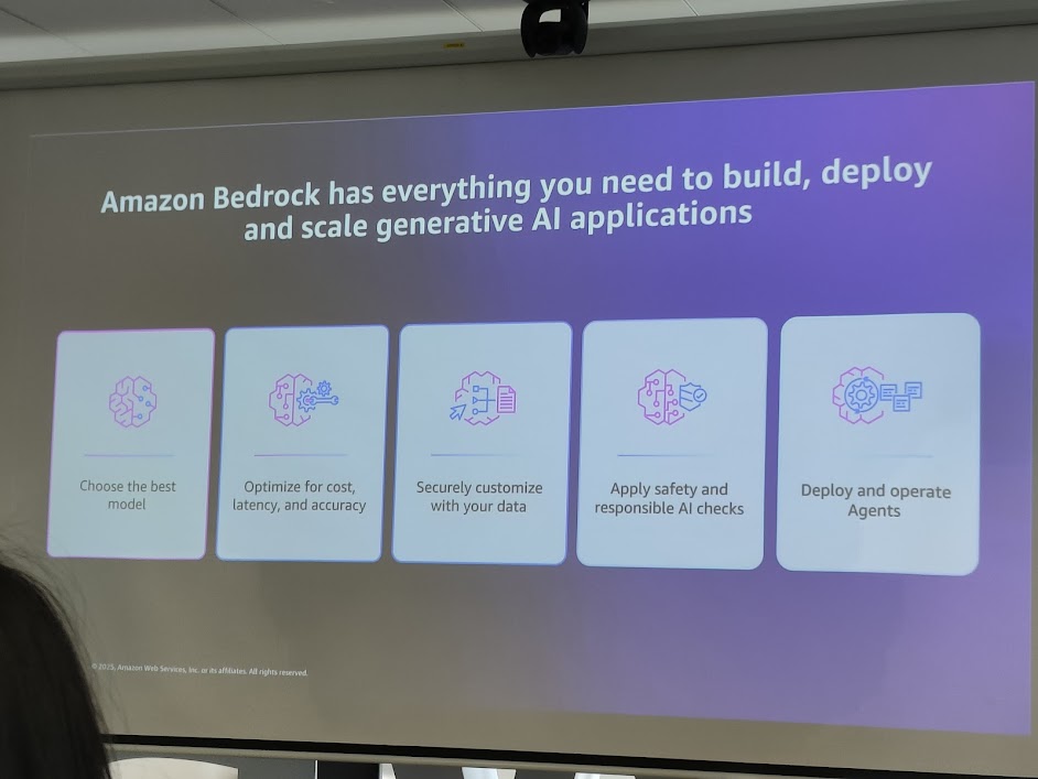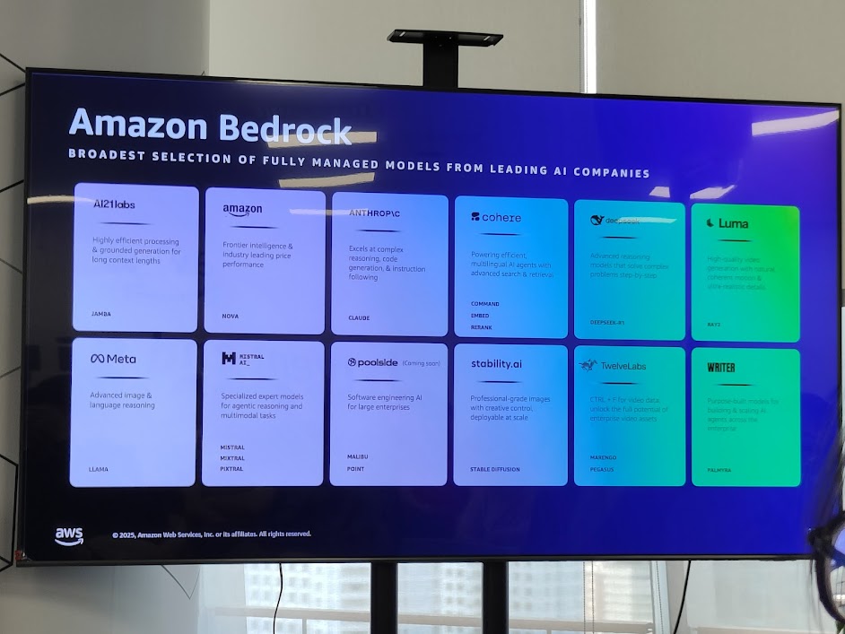 • Bedrock = model and tooling hub for applied AI development.